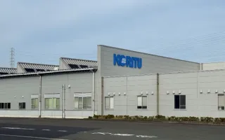 コーリツ本社工場の外観と、屋根上に新たに設置された太陽光発電設備